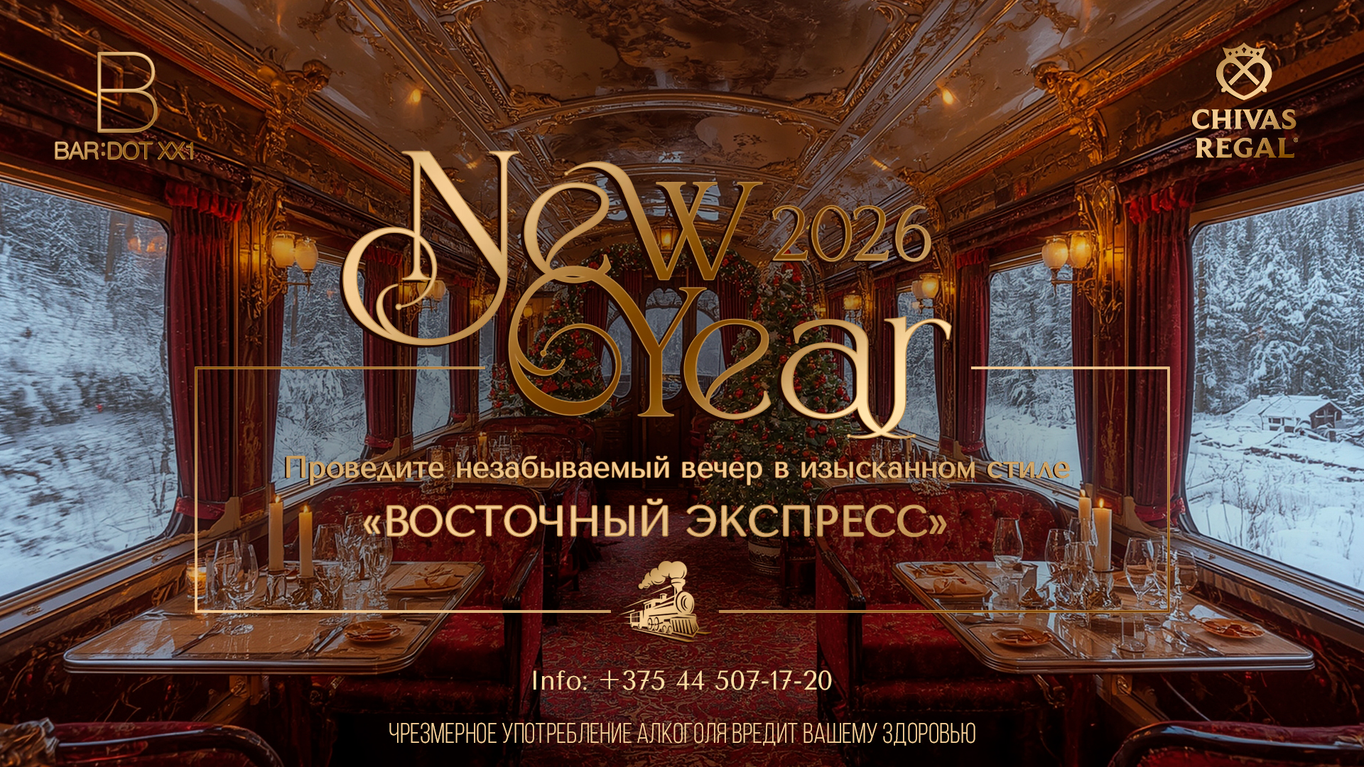 В этот Новый год ресторан BAR:DOT XXI превращается в роскошный вагон легендарного Восточного экспресса — с видом на огни ночного Минска, атмосферой 30-х годов и гастрономическим маршрутом по столицам Европы.